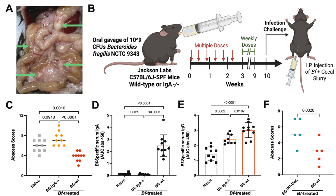预先经多剂量脆弱拟杆菌“训练”的野生型小鼠,腹腔内形成的感染性脓肿数量显著少于未处理小鼠;而IgA基因敲除(IgA⁻/⁻)小鼠,即便体内有高水平的Bf特异性IgG,仍与未处理小鼠一样易感。