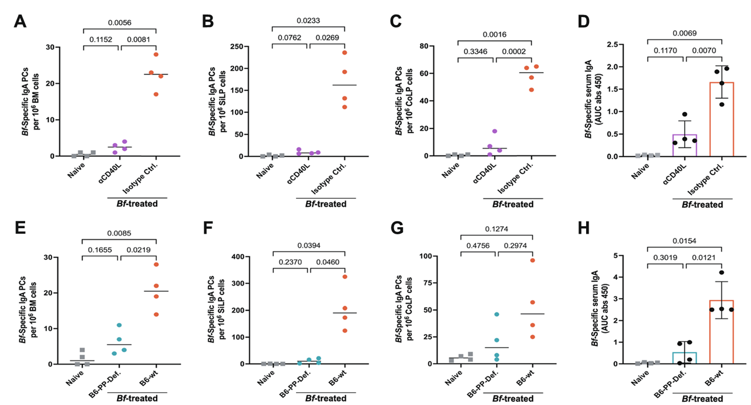 研究团队进一步验证:用抗CD40L抗体阻断T-B细胞相互作用后,骨髓、小肠及结肠中的 Bf 特异性 IgA 浆细胞几乎完全消失;而天生缺乏派尔结的小鼠,根本无法启动有效的全身性IgA应答。这意味着,派尔结与T细胞的参与,是脆弱拟杆菌诱导全身免疫防护的“必备条件”(图 2)。