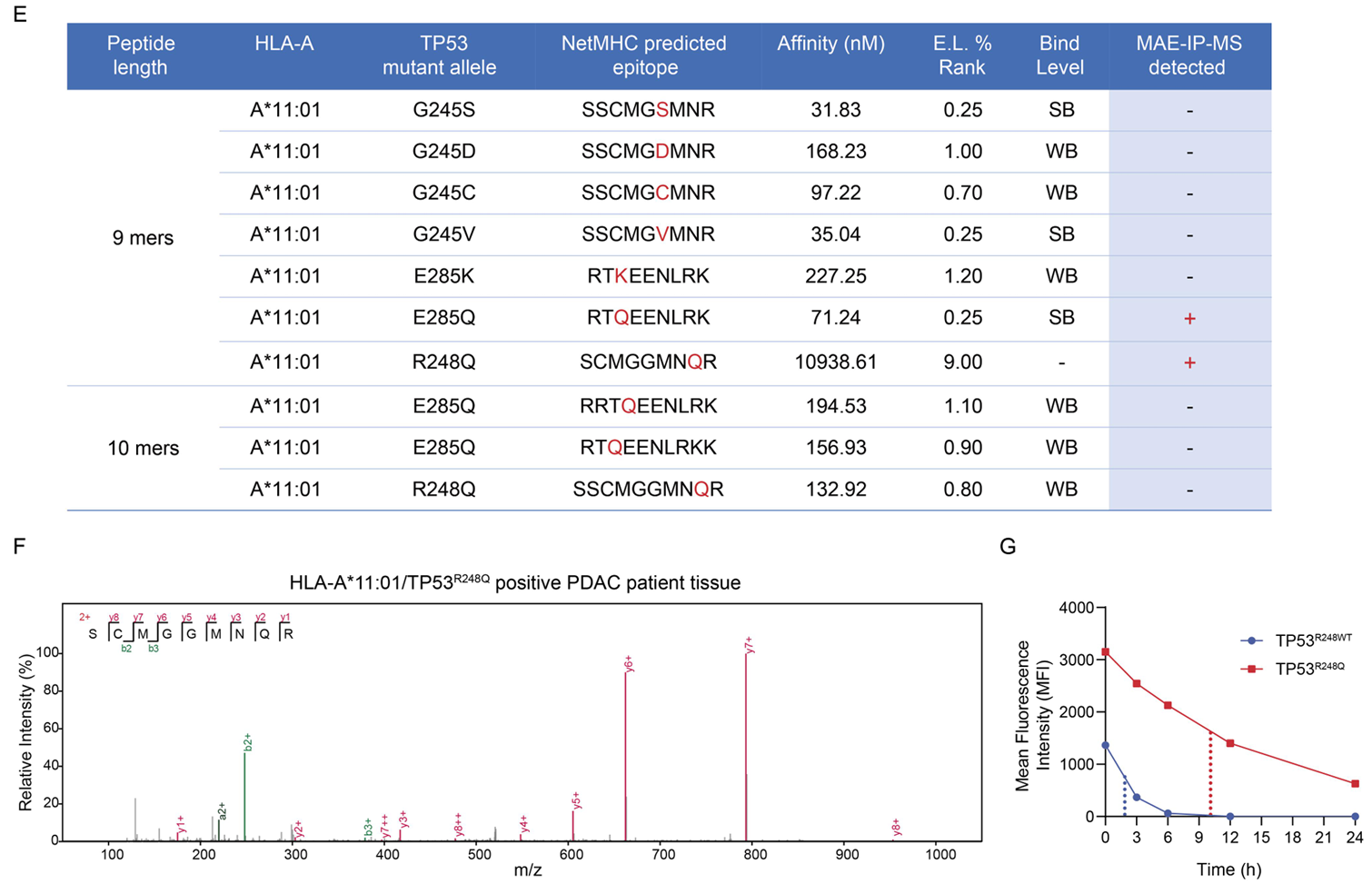值得注意的是,该肽段并未被NetMHCpan4.1软件预测为HLA-A*11:01结合肽,但通过质谱从头测序在细胞系及胰腺癌(PDAC)患者组织中均证实了其真实存在(图2)。实验显示,该肽段与HLA-A*11:01的结合半衰期长达10.1小时,远超野生型肽段的1.8小时。这表明依赖软件预测新抗原肽段与HLA的结合并不一定可靠,质谱从头测序可以提供更真实准确的结果。