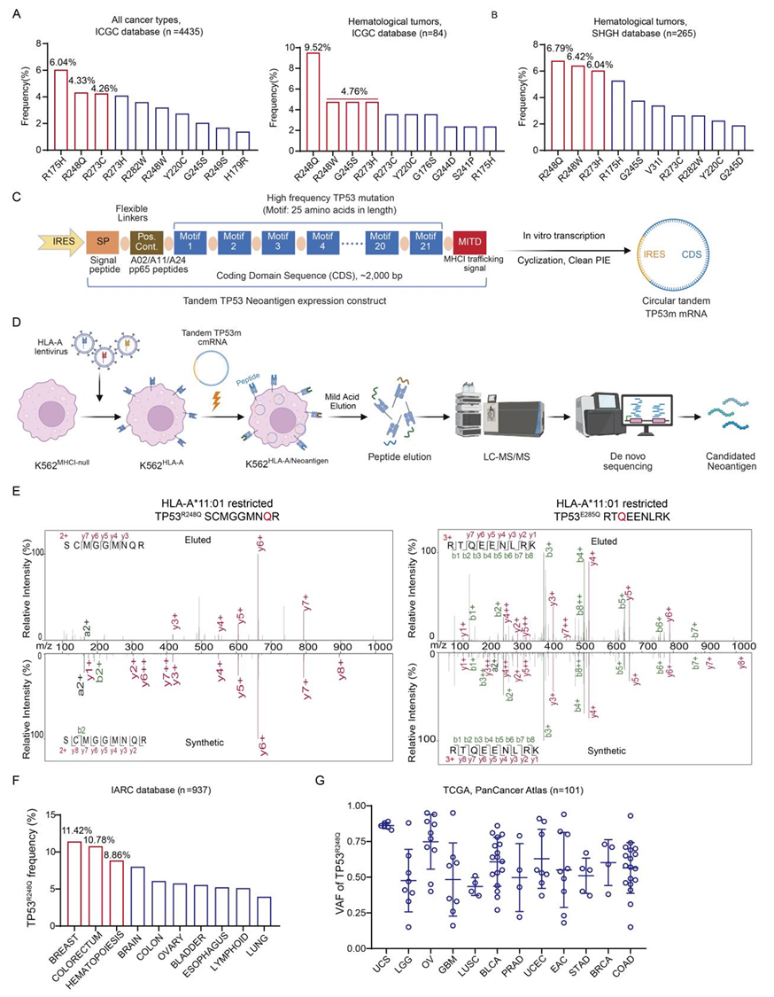 本研究通过合成编码TP53的7个热点突变(R175、Y220、R248 等)串联序列的环状mRNA (cmRNA),转染至表达HLA-A*11:01的K562细胞中,结合弱酸洗脱联合质谱(MAE/MS)和从头测序(de novo sequencing)的先进策略,精准鉴定出肿瘤细胞表面由TP53R248Q突变产生的新抗原肽段SCMGGMNQR。这一技术优势彻底避免了“预测存在但实际不呈递”的问题,确保了靶点的真实性与可用性(图1)。
